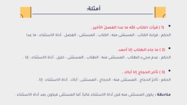 ?الحكم ? :?قراءة الكتاب ? ،?المستثنى منه ? :?الكتاب ? ،?المستثنى ? :?الفصل ? ،?أداة الاستثناء ? :?ما عدا?